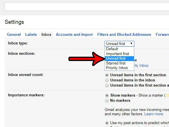 4. Adım: Sağdaki açılır menüyü tıklayınGelen Kutusu Türüve seçÖnce okunmamışseçenek.