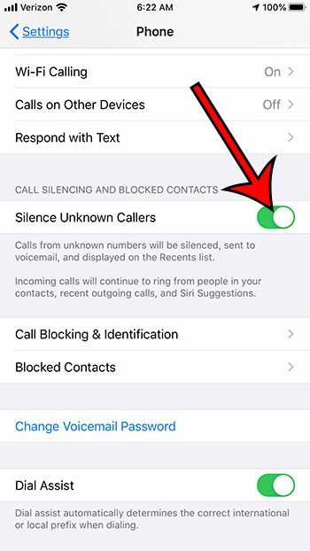 - Aşağı kaydırın ve bilinmeyen arayanların sessizliğinin sağındaki düğmeye dokunun.