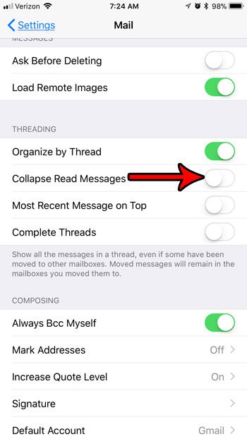 Bu makaledeki adımlar iOS 11.2.2'de bir iPhone 7 Plus'ta gerçekleştirildi. Bu, daha önce okuduğunuz e -postaların iş parçacığı içinde çöktüğü posta uygulamanızın iş parçacıklı mesajlarındaki özelliği devre dışı bırakacaktır.