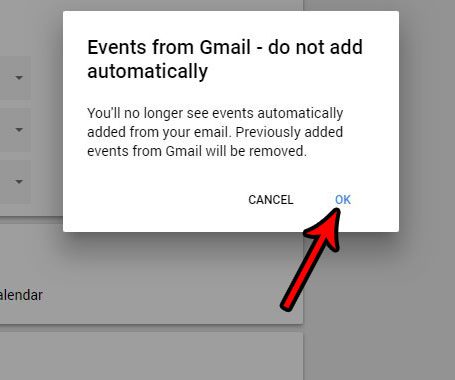 4. Adım: tıklayınTAMAMBu ayarı kapattığınızı onaylamak için düğme, daha önce eklenmiş Gmail olaylarını da kaldıracak.