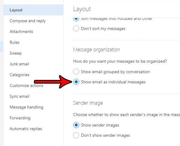 4. Adım: SeçinE -postayı tek tek mesajlar olarak gösteraltında seçenekMesaj Organizasyonumenünün bölümü.