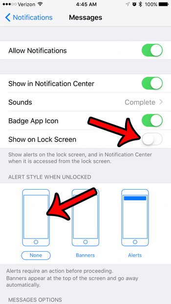 Örneğin, seçtimHiçbiriiçin seçenekUyarı StiliAşağıdaki resimde. Bu, yalnızca rozet uygulama simgesi numarasındaki artışla yeni metin mesajlarım olduğunu söyleyebileceğim anlamına gelir veya bildirim merkezini açmak için ekranın üstünden aşağı kaydırırsam.