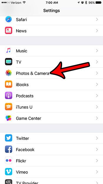 2. Adım: Aşağı kaydırın veFotoğraflar ve Kameraseçenek. (SadeceKameraiOS 12'de.)