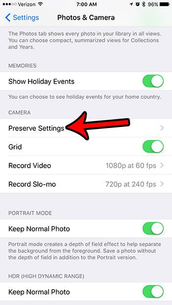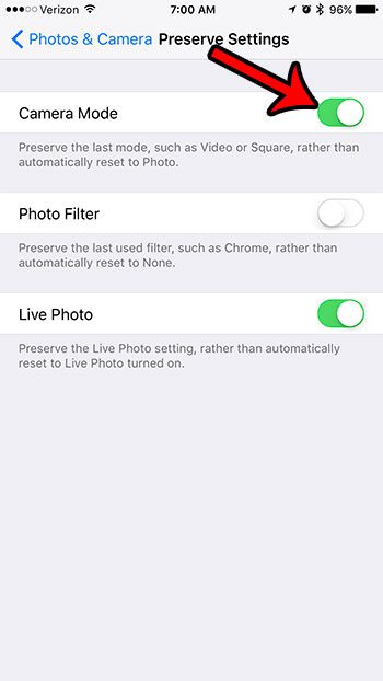 Neyse ki, iPhone'unuzda en son kullandığınız kamera modunu kaydetmenizi sağlayan bir ayara sahiptir, böylece uygulamayı bir sonraki başlattığınızda bu mod etkin olur. Aşağıdaki öğreticimiz, iPhone 7'nizde bu ayarı nerede bulacağınızı gösterecektir.