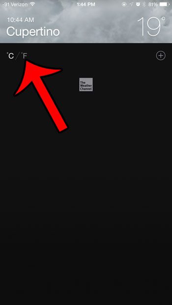3. Adım: seçinFekranın sol üst kısmında seçenek. Beyaz olarak vurgulanan mektup, şu anda hava durumu uygulaması için kullanılan birim formatıdır.