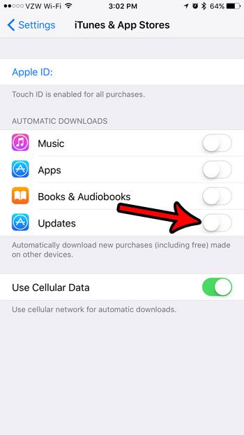 Adım 3: Sağdaki düğmeye dokununGüncellemeler. Bu, düğmeyi sola taşımalı ve ayrıca düğmenin etrafındaki yeşil gölgeleri çıkarmalıdır. Otomatik uygulama güncellemeleri aşağıdaki resimde iPhone'da devre dışı bırakıldı.