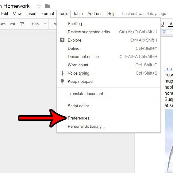 Artık Google Dokümanlar Devre Dışı Otomatik Biçimlendirme Kılavuzumuzu tamamladığınıza göre, Google Dokümanlarının yazdığınızda kendi biçimlendirmesini uygulamasını sağlayan çeşitli ayarları kontrol eden menüyü bulabilirsiniz.