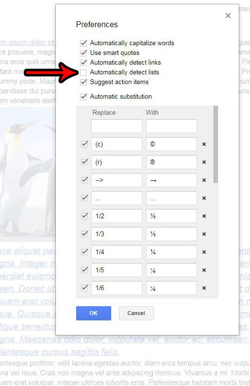 Adım 3: Kutuyu solundaki işaretini kaldırınListeleri otomatik olarak algılayınsonra tıklayınTAMAMPencerenin altındaki düğme.