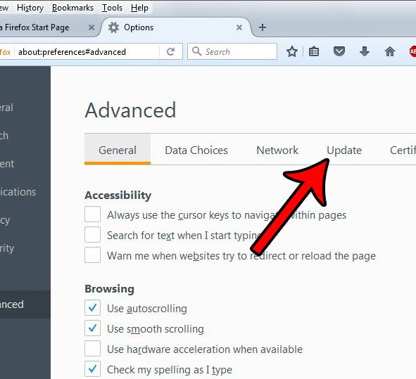 Aşağıdaki adımlar, masaüstünüzdeki veya dizüstü bilgisayarınızdaki Firefox web tarayıcısındaki bir ayarı değiştirecektir. Bu adımları tamamladıktan sonra, Firefox artık güncellemeleri kullanılabilir hale geldikçe otomatik olarak yüklemeyecektir. Bir güncelleme mevcut olduğunda uyarılma seçeneğiniz veya asla güncellemeleri kontrol etmeyeceksiniz.