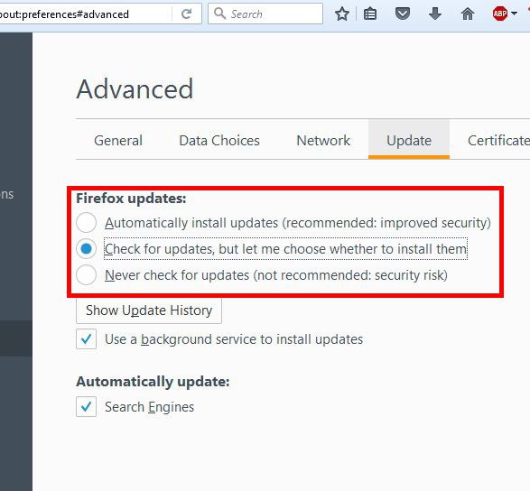 Adım 6: Altında listelenen seçeneklerden tercih ettiğiniz güncelleme ayarı seçinFirefox güncellemeleri.