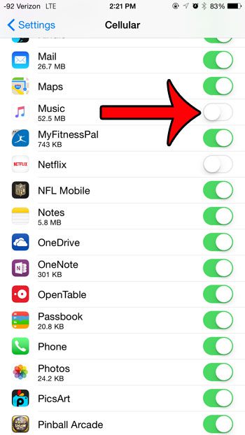 3. Adım: Aşağı kaydırın ve bulunMüzikSeçenek (her şey alfabetik olarak listelenmelidir,) sonra hücresel veri kullanımını devre dışı bırakmak için sağdaki düğmeye dokunun.