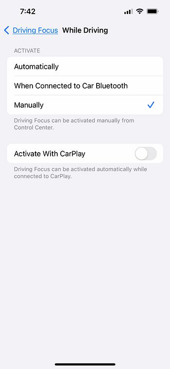 Bu ayarı manuel olarak çevirmediyseniz ve gelecekte kendi başına etkinleştirilmesini önlemek istiyorsanız,Ayarlar>Odak>Sürüş> Ardından aşağı kaydırın ve sürüş düğmesini seçin> ardından seçinManuel olarak.