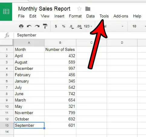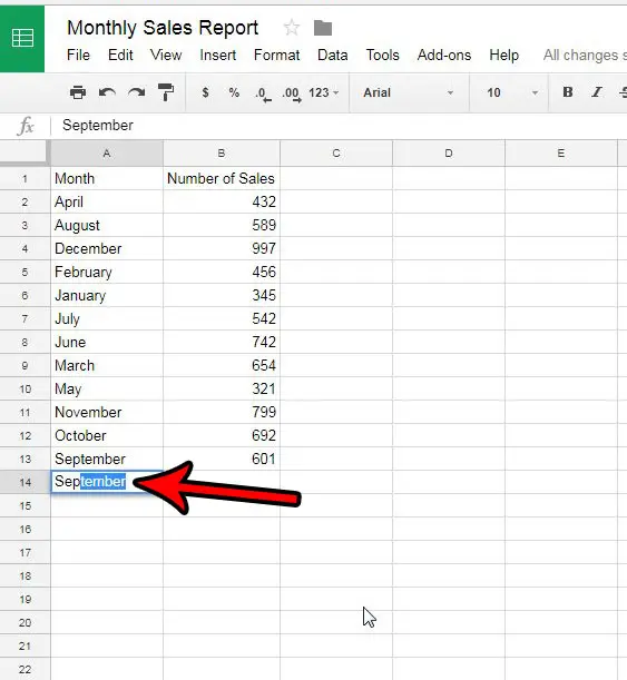 Bu makaledeki adımlar, veri yazarken Google sayfalarının size otomatik tamamlama seçeneği sunmasını önleyecektir. Bununla, zaten sayfada bulunan bir kelimeyi yazmaya başladığınızda ortaya çıkan mavi renkle vurgulanan metni kastediyoruz. Örneğin, aşağıdaki resimde, Sheets bana kelimenin ilk birkaç harfini yazdığım Eylül kelimesi için otomatik tamamlama seçeneği sunuyor.