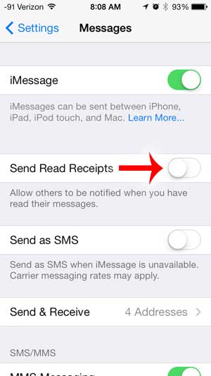 Adım 3: Sağdaki düğmeye dokununOkuma Makbuzları Gönderinkapatmak için. Özellik kapatıldığında düğmenin etrafında yeşil gölgeleme olmayacaktır.
