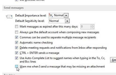 Posta sekmesini tıklayınAdım 5:Mesaj GönderPencerenin ortasındaki bölüm, ardından solundaki kutuyu tıklayınBir eki eksik olabilecek bir mesaj gönderdiğimde beni uyaronay işaretini kaldırmak için.