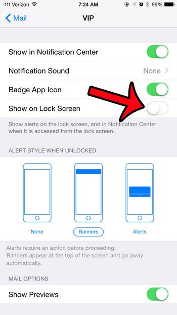 - Adım 5: Sağdaki düğmeye dokununKilit ekranında gösterAyrımı kapatmak için. Düğmenin etrafında yeşil gölgeleme olmadığında kapatıldığını bileceksiniz. Örneğin, ayar aşağıdaki resimde kapatılır.