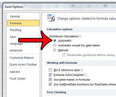 Adım 5: Solundaki daireyi tıklayınOtomatikaltındaÇalışma kitabı hesaplaması.