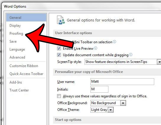 4. Adım: tıklayınKanıtlamaSekme sol tarafındaKelime Seçenekleripencere.