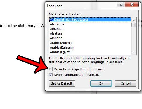 Kutunun solundaki kutununYazım ve dilbilgisi kontrol etmeyinkontrolsüz. Aşağıdaki görüntü gibi görünmelidir. Sonra tıklayabilirsinizTAMAMBu konuda düğmeDilpencere.