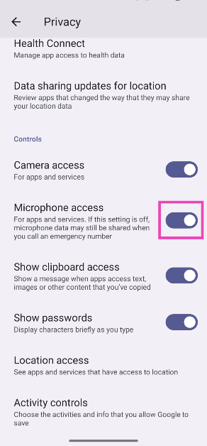 3. Adım:Aşağı kaydırın ve yanındaki geçiş anahtarını aç/kapatMikrofon erişimi.