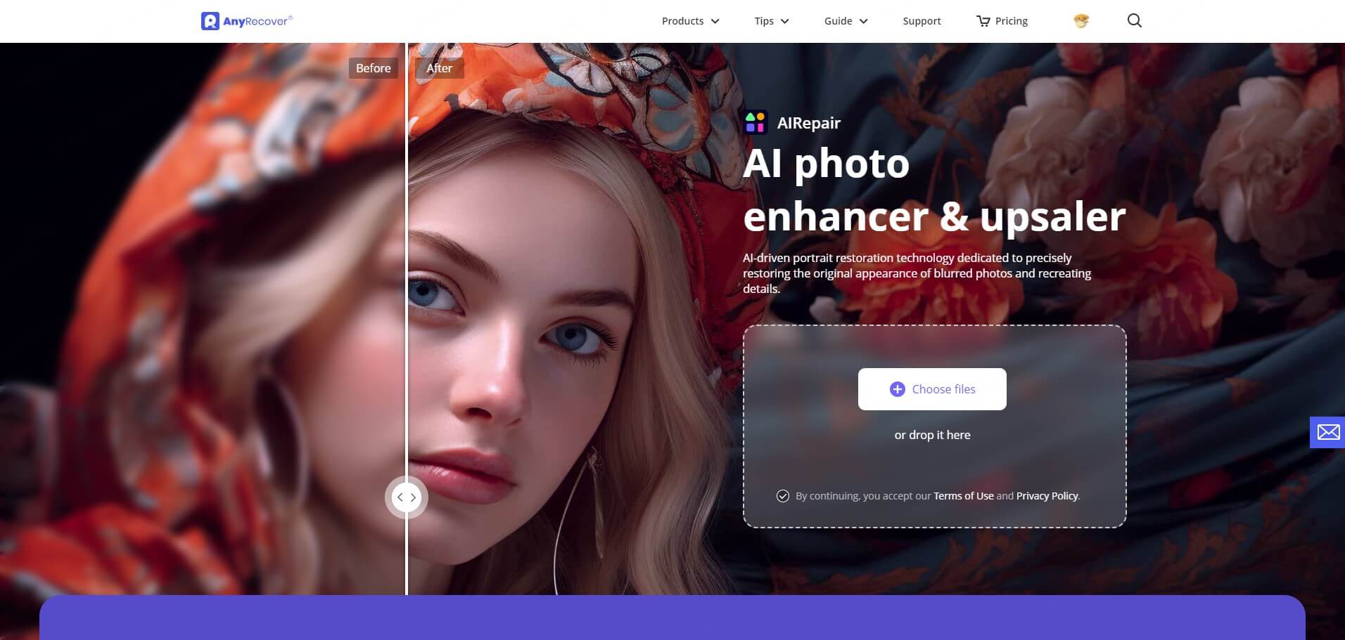 AnyRecover Airepair, bulanık görüntüleri kolaylıkla onarmak için AI teknolojisinin gücünü kullanabilen gelişmiş bir fotoğraf dosyası onarım çevrimiçi aracıdır. Bulanık fotoğraflar da dahil olmak üzere her türlü bozuk dosyayı kurtarabilir. Yüksek bir kurtarma oranına ve piyasadaki dosya onarım araçları arasında dosyaları onarmak için en hızlı hızlardan birine sahiptir.