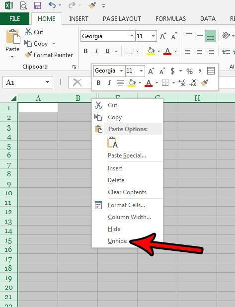 Sağ tıklayın, ardından “Unhide” seçeneğini seçinBu bölümdeki adımları sadece bazı sütunlarınız için takip ederek, bu çalışma sayfasındaki diğer gizli sütunlarınızdan herhangi biri bu şekilde kalacaktır.