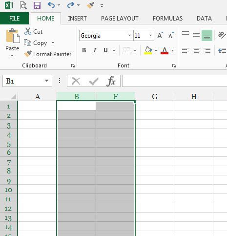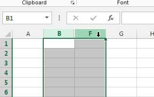 Yalnızca belirli sütunları güçlendirmek istiyorsanız, gizli sütunların her iki tarafındaki sütunları seçebilirsiniz. Örneğin, sütunlarC-DVeEaşağıdaki resimde gizlidir. Yalnızca bu sütunları güçlendirmek istiyorum, bu yüzden sütunları seçiyorumBVeFtüm çalışma sayfası yerine.