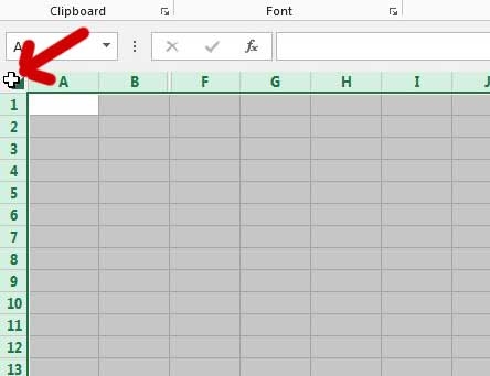 Adım 2: Sayfayı seçmek için çalışma sayfasının sol üst köşesini tıklayın. Mektup arasındaki alanı tıkladığınızı unutmayın.A”Ve sayı”1”Aşağıdaki resimde tanımlanmıştır.