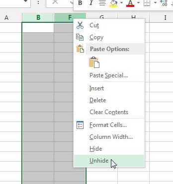 Seçilen bir sütun harfini sağ tıklayın, ardından unhide'ı tıklayınExcel'de sadece gizli sütunlarınızdan sadece bazılarını nasıl şekillendirir?