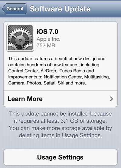 - Güncelleme 752 MB boyuttadır, ancak yükleme ekranında, kurulum için iPhone 5'inizde 3.1 GB depolama alanına ihtiyacınız olan bir mesaj var. İPhone 5'inizde yer açmanın ek yollarını öğrenmek için bu makaleyi okuyabilirsiniz.