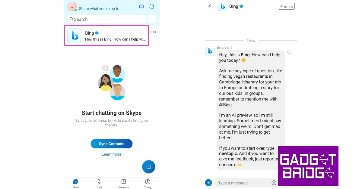 Openai'ye kaydolmadan ChatGPT'ye erişmenin bir başka harika yolu da Skype kullanmaktır. Microsoft'un Bing AI'sını mesajlaşma ve çağrı uygulamasına entegre ederken, yalnızca bir muslukla kolayca erişebilirsiniz. Bing Chatbot'u konuşma listenizin başında bulacaksınız. Bir konuşmayı bitirdikten sonra, yeni bir tane başlatmak için 'newtopic' girmeniz yeterlidir.