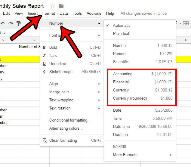 Google Sheets, elektronik tabloya belirli hücrelerdeki değerlerin para birimi olduğunu anlatmanızı sağlayan bir sayı biçimlendirme seçeneğine sahiptir.