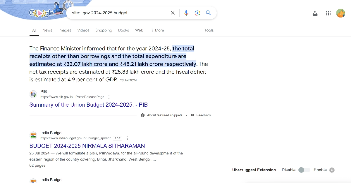 2. Adım:YazınArama sorgusu. Örneğin: 2024-25 bütçesi ile ilgili ayrıntıları arıyorsanız, yazınSite: .gov Bütçesi 2024-25.