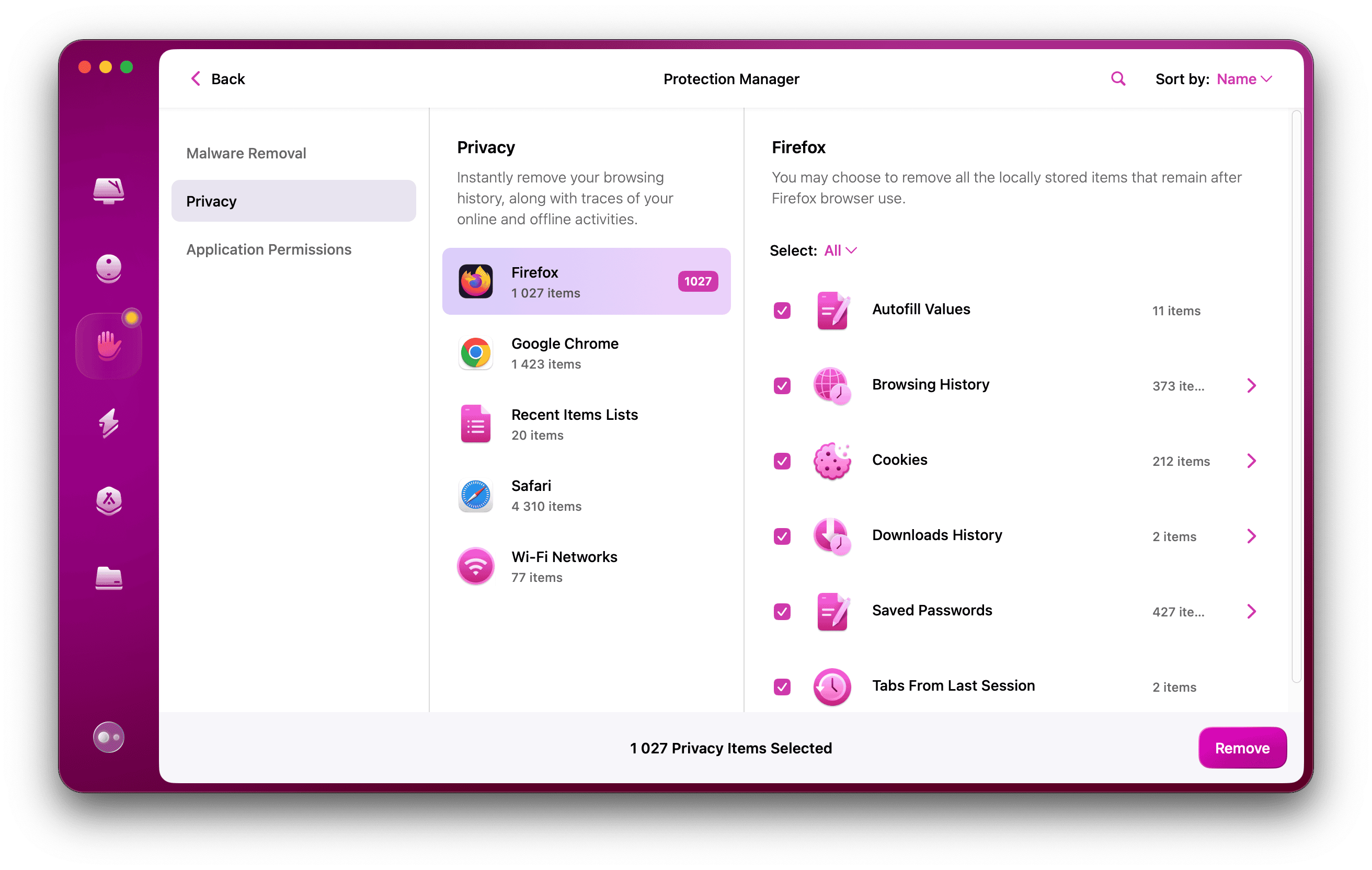 Kenar çubuğundan Gizlilik'i seçin, öğeler seçin ve Kaldır'ı tıklayın.