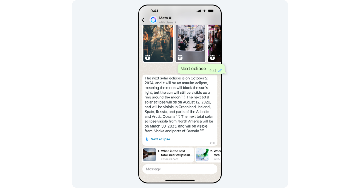 WhatsApp'ta bir profesyonel gibi Meta Ai bu şekilde. WhatsApp dışında Meta AI Chatbot'u Instagram ve Facebook'ta da kullanabilirsiniz. Önümüzdeki aylarda Meta, tüm elçileri arasında sohbet botuna daha fazla özellik ekleyecek. Chatbot'u telefonunuzda bulamıyorsanız,Ve tekrar deneyin. Meta, chatbot'u aşamalar halinde piyasaya sürdüğü için, cihazınızda mevcut olması biraz zaman alabilir.