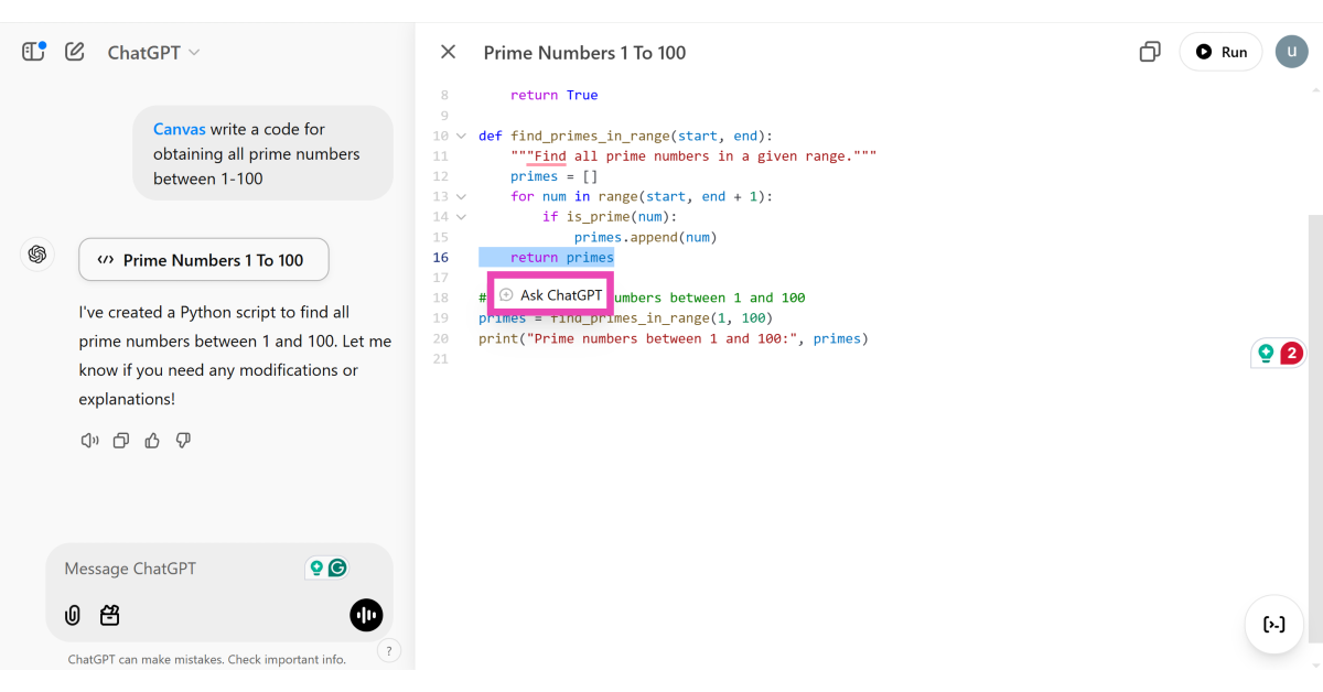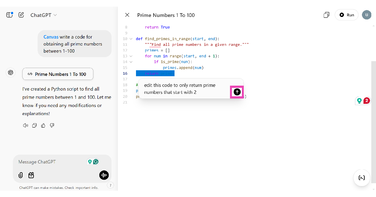 Tuval ile bir kod veya metin parçası oluşturmak için chatgpt alabilir ve ardından projeyi değiştirmeden sonucun belirli bölümlerinde değişiklik yapabilirsiniz. Örneğin, chatbot'tan belirli bir satırı genişletmesini veya belirli kelimeleri daha iyi alternatiflerle değiştirmesini isteyebilirsiniz. Yeni değişiklikler projenin geri kalanını göz önünde bulundurarak yapıldı. Bir bakıma, tuval size proje üzerinde daha fazla editoryal kontrol sağlar.