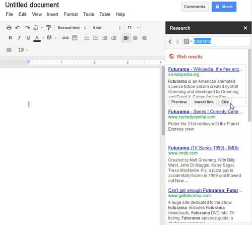Arama alanına bir arama terimi yazarak Google Dokümanlar Araştırma aracını nasıl kullanacağınızı öğrenmeye başlayın. Araştırma aracı, Google Search'i 'kendi tarayıcı sekmesinde kullanıyorsanız beklediğiniz sonuçları görüntüleyecektir.