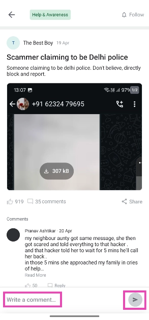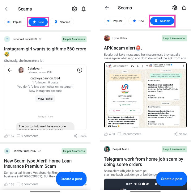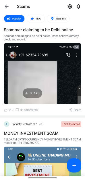 Scamfeed, Truecaller uygulamasında kullanıcıların deneyimlerini kötü amaçlı dolandırıcılıklarla paylaşabilecekleri özel bir bölümdür. Mesajları popülerlik, zaman ve konuma göre sıralayabilirsiniz. Yükselen herhangi bir aldatmaca farkındaysanız, Truecaller topluluğuyla paylaşmayı seçebilirsiniz.