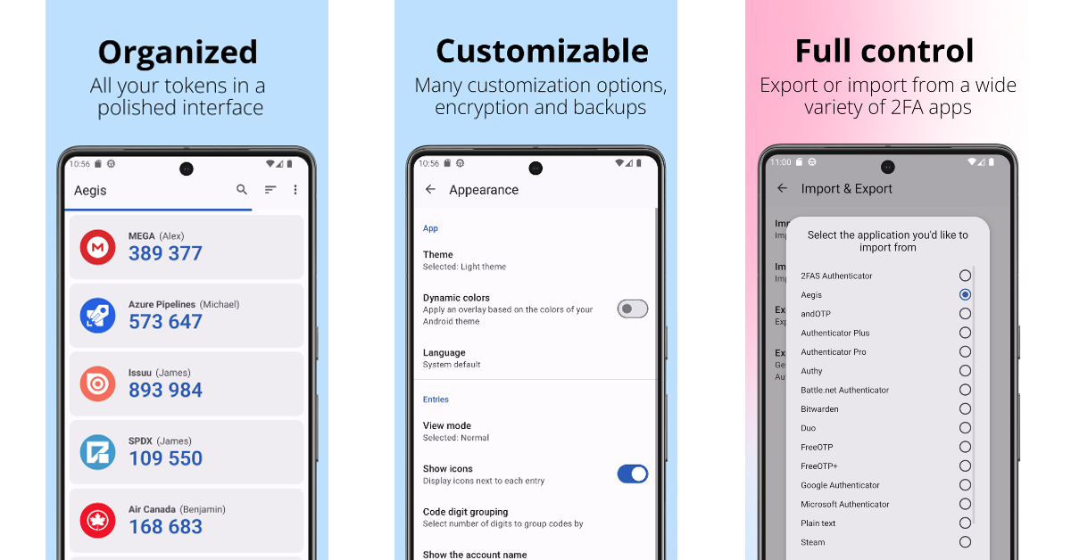 Twitter için 2FA'yı ekstra bir maliyet olmadan etkinleştirmek için kullanabileceğiniz en iyi açık kaynaklı kimlik doğrulayıcı uygulamalardan biridir. Uygulama, kimlik doğrulama-HOTP ve TOTP için iki endüstri standardı algoritmasını destekler. Uygulama Google Authenticator'ı destekliyorsa, Aegis'i de destekleyecektir. Kimsenin kimlik doğrulama kodlarına erişmediğinden emin olmak için Aegis'i bir şifre ile güvence altına alabilirsiniz. Aegic hakkında gerçekten sevdiğimiz şey, birden fazla 2FA kodunun depolanmasını kolaylaştıran renkli ve erişilebilir arayüzüdür.