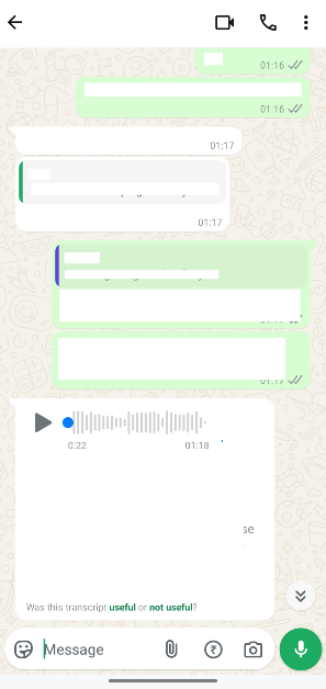 WhatsApp'ın ses notu transkripsiyonları genellikle çok doğrudur. Bununla birlikte, doğruluğu büyük ölçüde konuşma ve kaydın kalitesine bağlıdır. Messenger bir ses notu için bir transkript oluşturamazsa, bunun nedeni aşağıdaki nedenlerden biri olabilir: