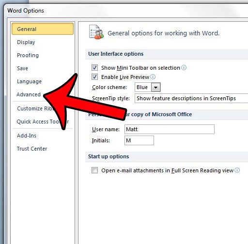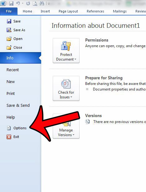 Adım 3: TıklayınSeçeneklerPencerenin sol tarafındaki sütunun altındaki. Bu başlıklı yeni bir pencere açacakKelime Seçenekleri.