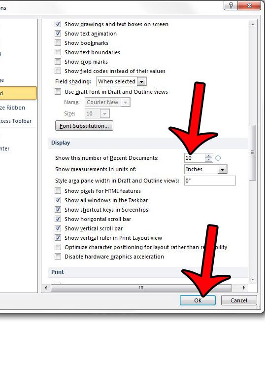 Adım 5: Aşağı kaydırın, ardından alanın sağındaki alanın içine tıklayınBu son belgeyi göster. Göstermek istediğiniz belge miktarını girin, ardındanTAMAMPencerenin altındaki düğme.