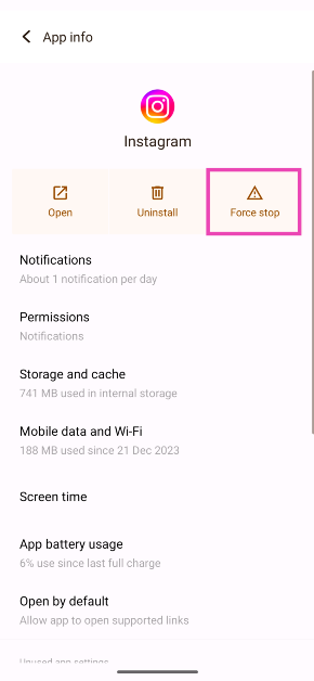 Instagram uygulamasını cihazınızdaki uygulama ayarlarından çıkarın ve bildirimden kurtulmak için önbelleğini temizleyin.