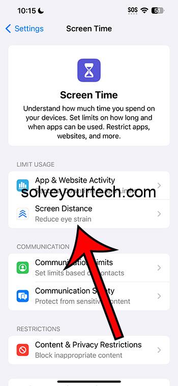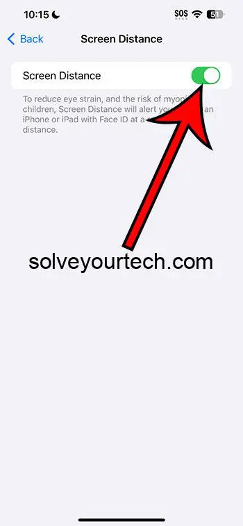 İPhone'unuzdaki ekran mesafesi ayarını etkinleştirebilir veya devre dışı bırakabilirsiniz.Ayarlar> Ekran Süresi> Ekran Mesafesi>ve dokunarakEkran mesafesidüğme.