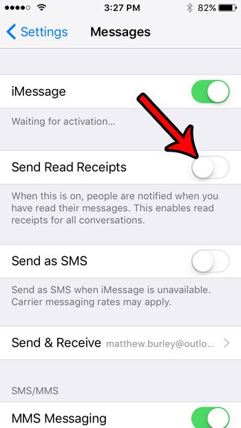 Adım 3: Sağdaki düğmeye dokununOkuma Makbuzları Gönderinkapatmak için. Bu ayar kapatıldığında düğmenin etrafında yeşil bir gölgeleme olmaması gerektiğini unutmayın. Aşağıdaki resimde okuma makbuzlarını devre dışı bıraktım. Muhtemelen orada bir kısa mesaj yönlendirme seçeneğiniz var. Bu makale, bunun ve nasıl kurulacağı hakkında daha fazla bilgi edineceği açıklayacaktır.