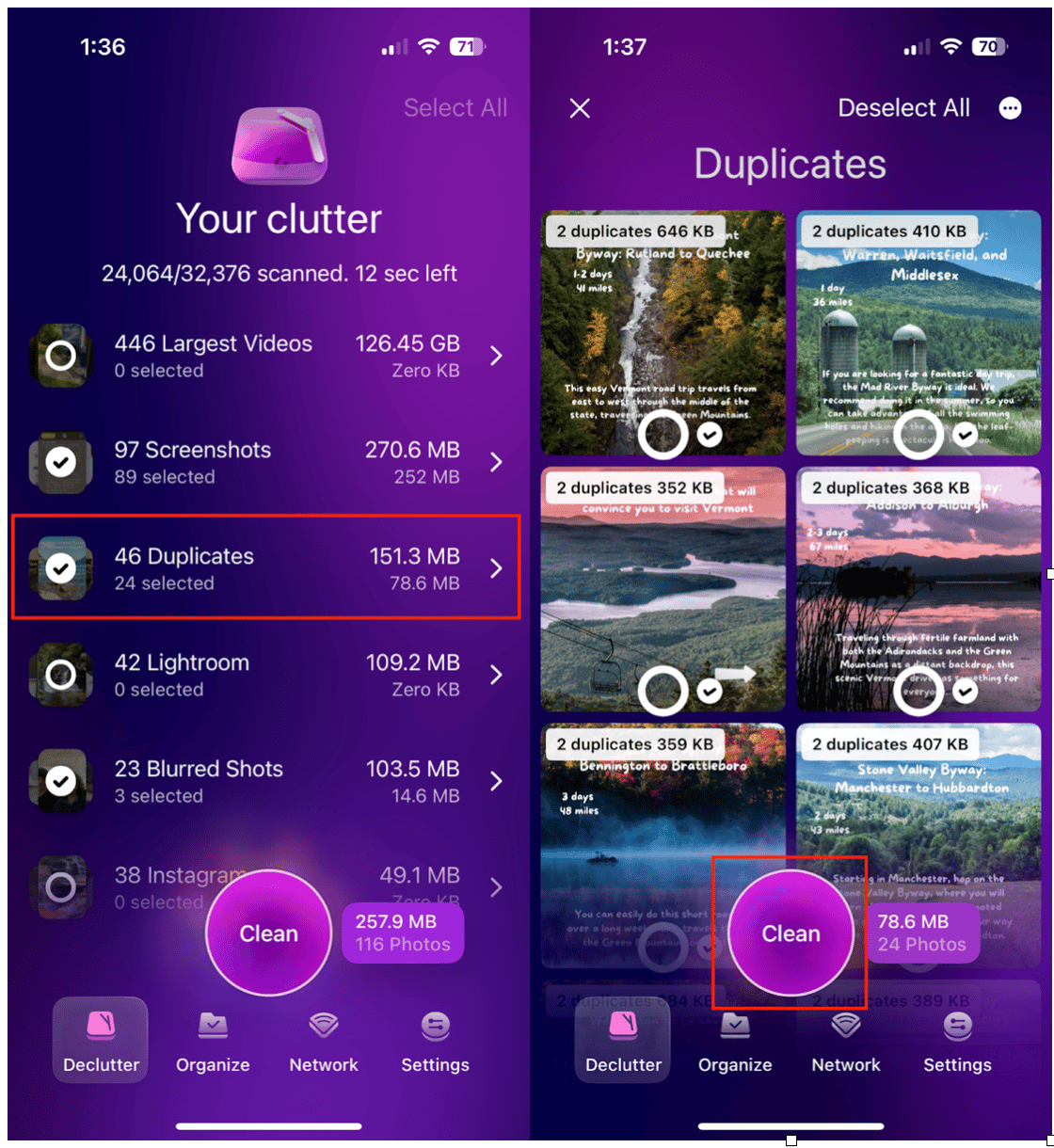 - Kopyaları bulun ve silin: Open CleanMy®phone,'Declutter'e dokunun ve kopyalar seçin. Uygulama otomatik olarak kopyaları algılayacaktır, bu yüzden sadece 'temiz' ve kaybolacaklar.
