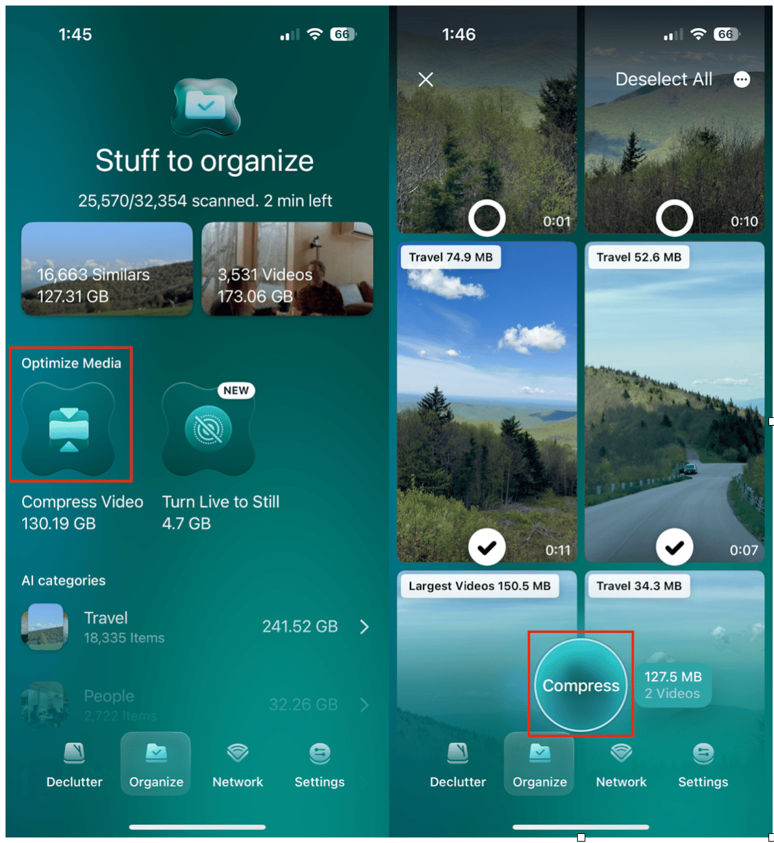 - CleanMy®phone kullanınKaliteden ödün vermeden en büyük dosyalarınızın boyutunu azaltmak için video sıkıştırma aracı. 'Organize', ardından 'Videoyu sıkıştırın' seçeneğini seçin. Sıkıştırmayı istediğiniz videoları seçin, ardından yerden tasarruf etmek için 'sıkıştır' ı dokunun.