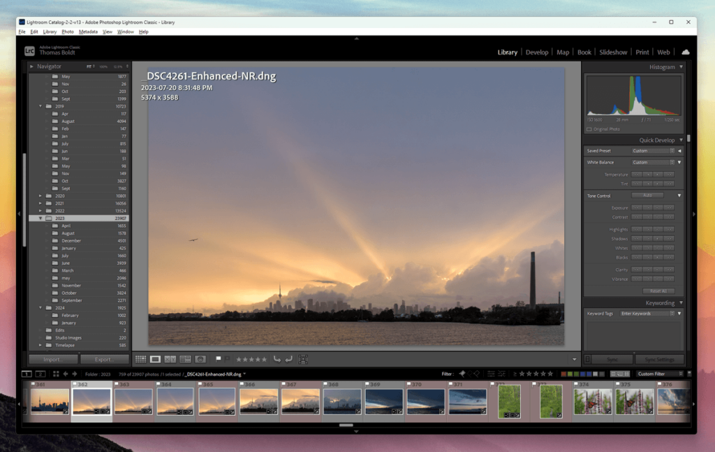 Mevcut meta verilerin herhangi bir kombinasyonunu kullanarak görüntü kütüphanenize filtreleyebilir ve göz atabilirsiniz, bu nedenle belirli bir günde belirli bir kamera ve lens kombinasyonu ile çektiğiniz tüm ISO 800 görüntülerini bulmanız gerekiyorsa, ayarlamak sadece birkaç tıklama alır. Benzer karmaşık filtreleme kurallarını kullanan akıllı albümler bile oluşturabilirsiniz.
