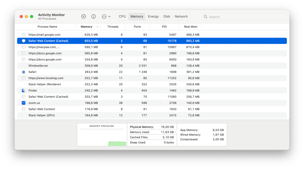 - Pencerenin altındaki grafik etiketli bellek basıncını kontrol edin. Trafik ışığı ölçeğinde çalışır: Yeşil sağlıklı RAM alanını gösterir, sarı, RAM'i serbest bırakmak için yapabileceğiniz küçük değişiklikler olduğu anlamına gelir ve Red daha ciddi sorunlarınız olduğunu söyler.
