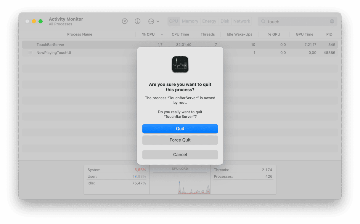 - Etkinlik monitörünü çıkın ve TouchBarServer otomatik olarak yeniden başlatılacaktır.